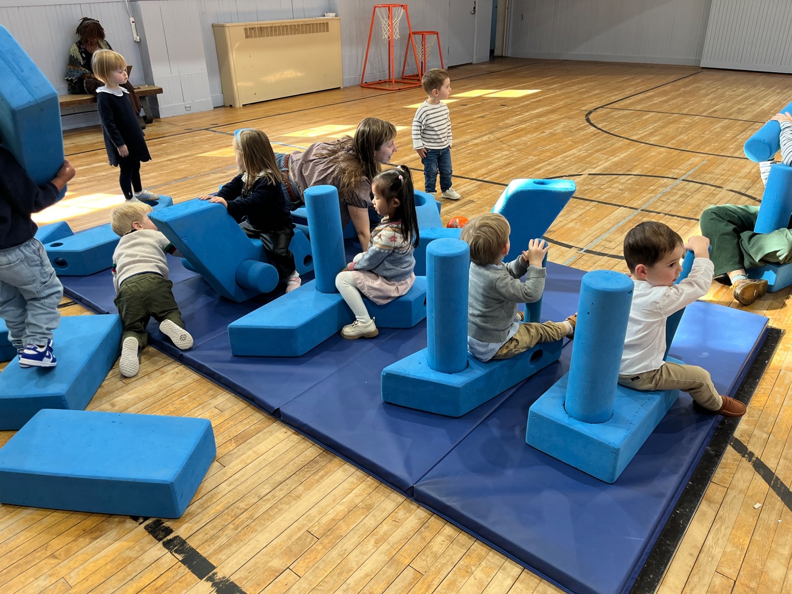 Sometimes in the gym we work with blue blocks. Our favorite game is Surfing, where we build our own surfboards and take them to the beach (the blue mat). Then we listen to surf music and dance!