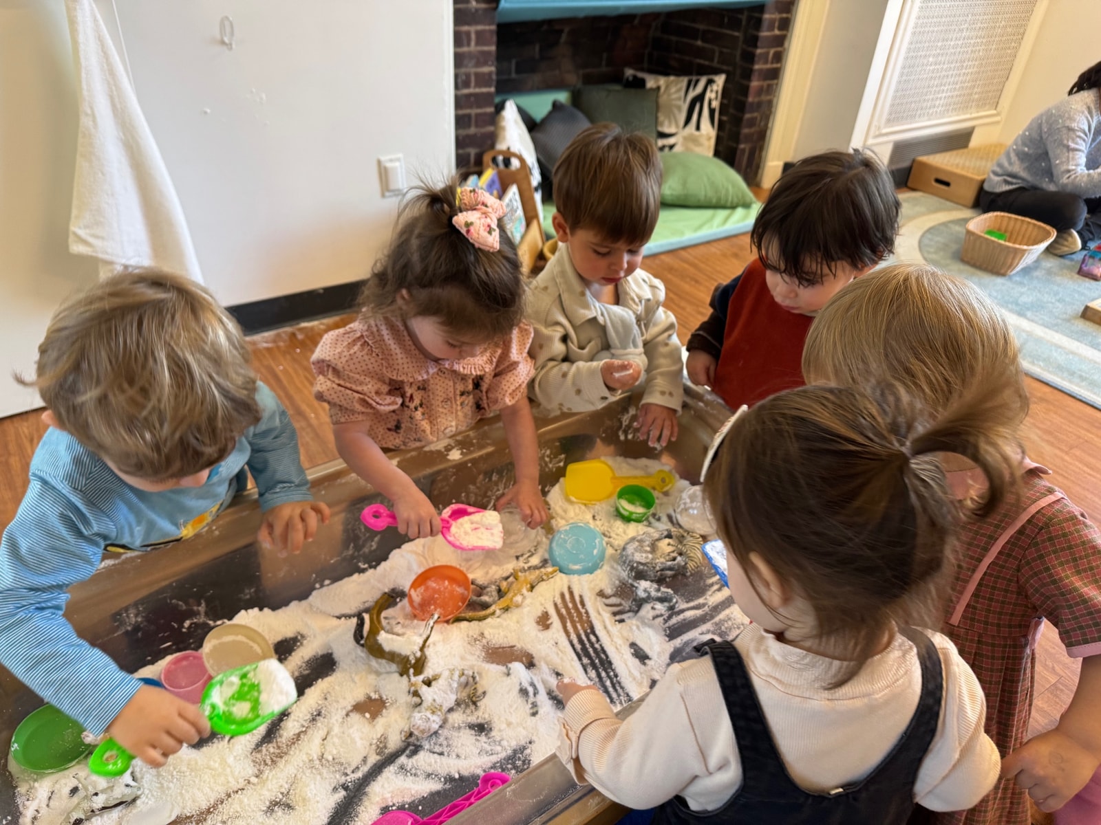 When the White Room doors opened, no time was wasted, and the children dove right back into all the fun! We continued our exploration of ‘snow’ (baking soda and shaving cream), built numerous structures with Magna-Tiles and Haba blocks, created some cardboard mark-making with oil pastels, and began engaging in dramatic play with a kitchen and dining room setup. We also tried out some new snacks, such as jam sandwiches, avocado, and oranges. Check it out below:
